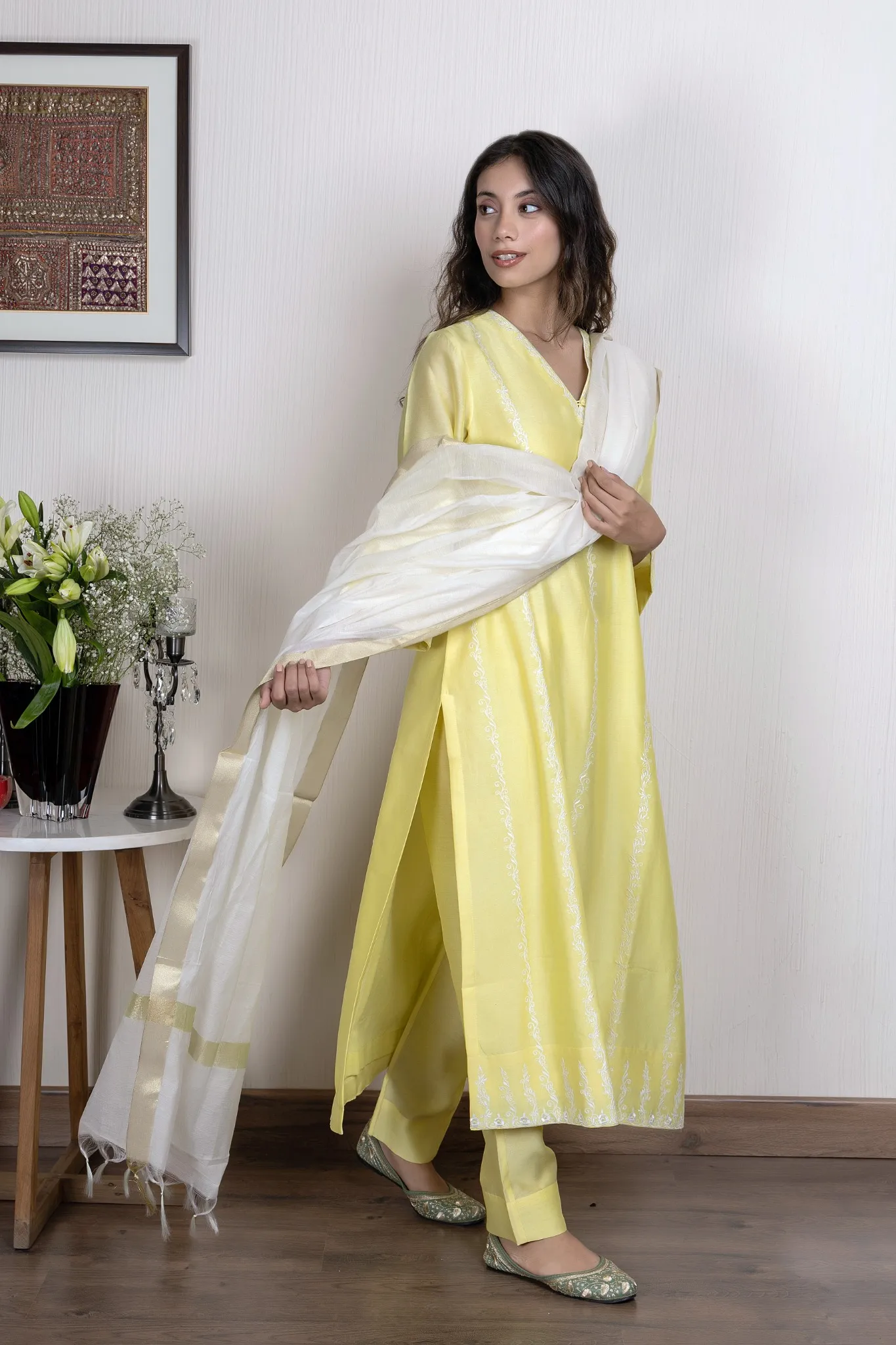 Yellow chanderi embroidered kurta paired with Chanderi pants