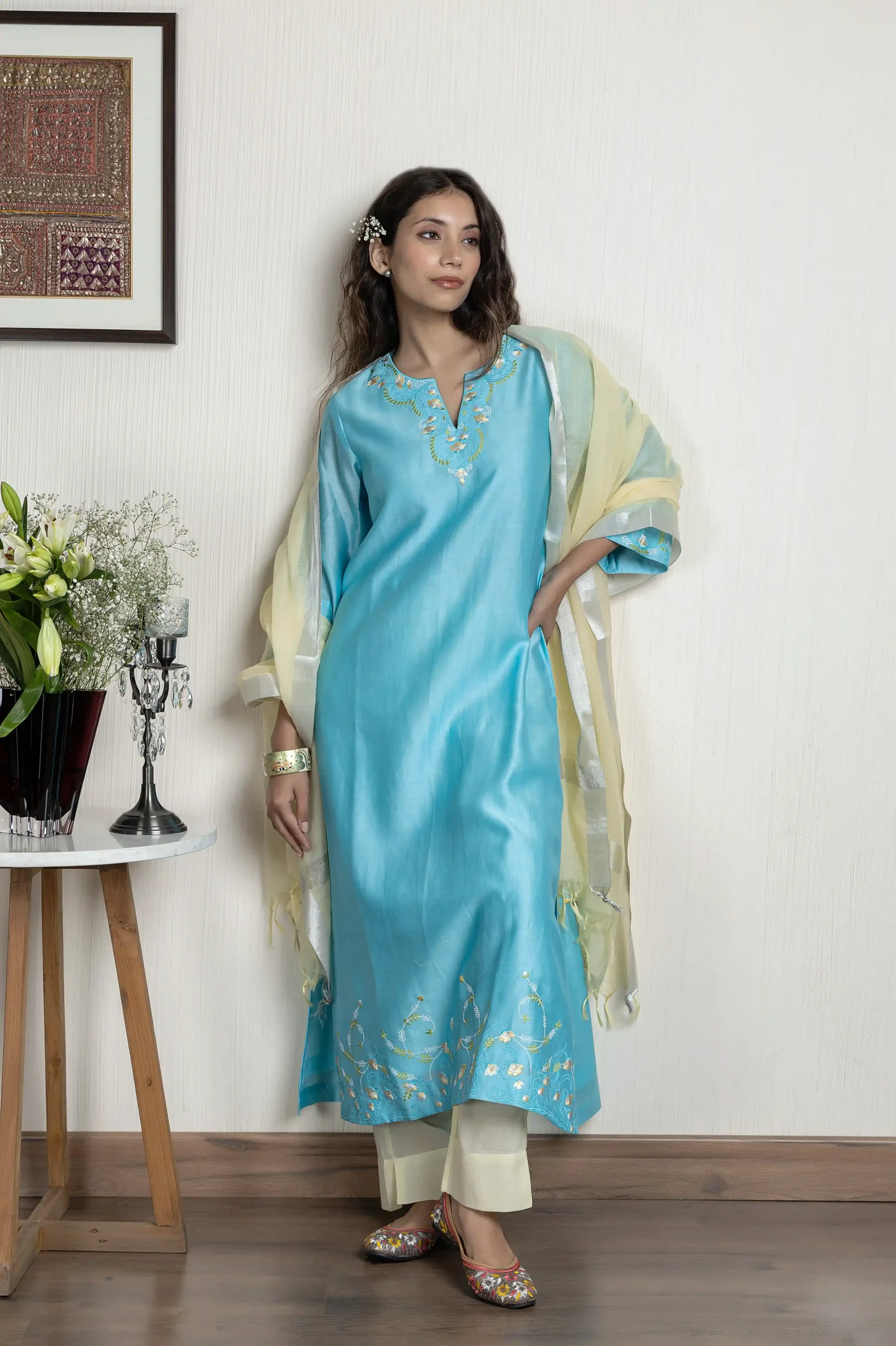 Sea Green embroidered Chanderi kurta paired with chanderi pants and dupatta