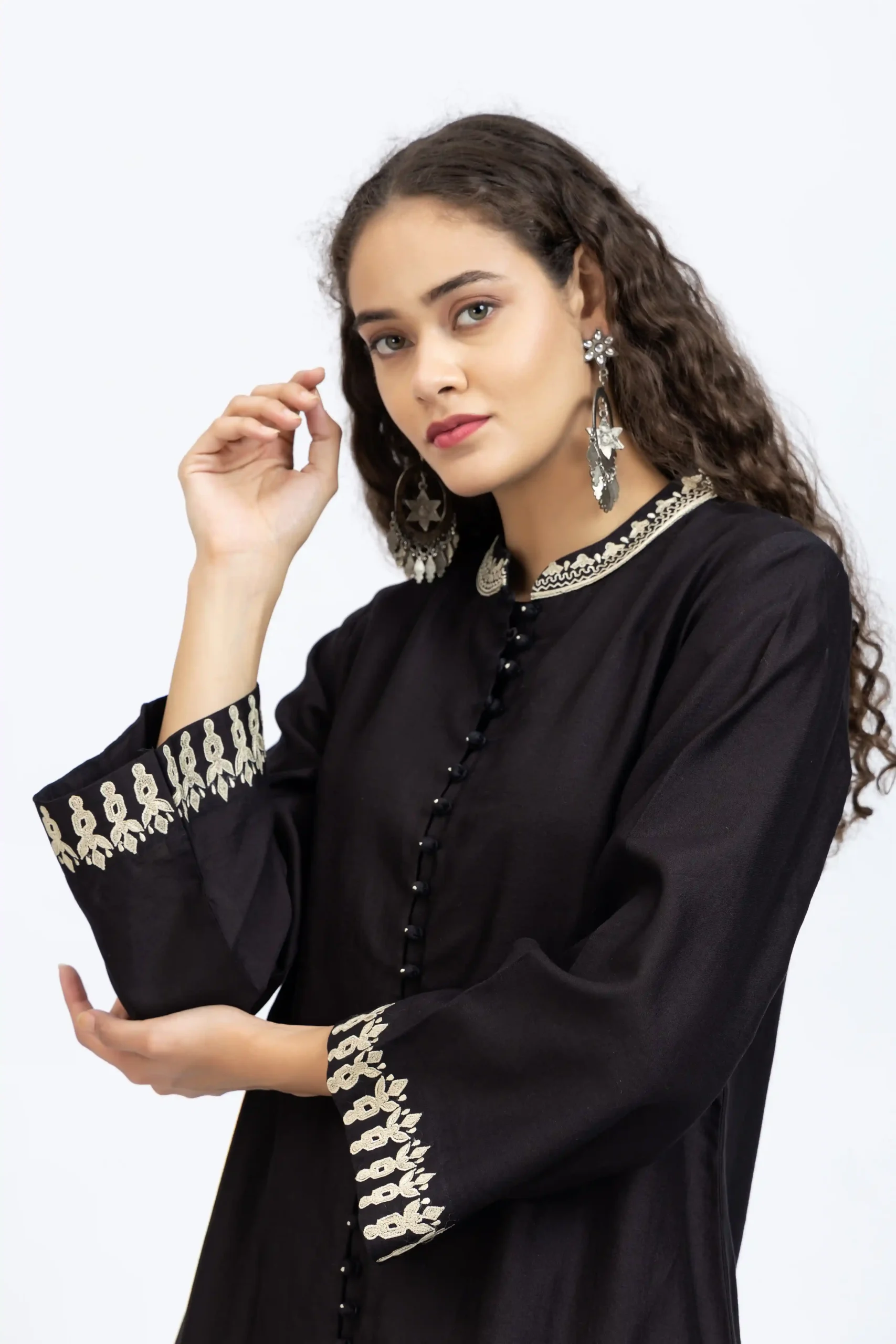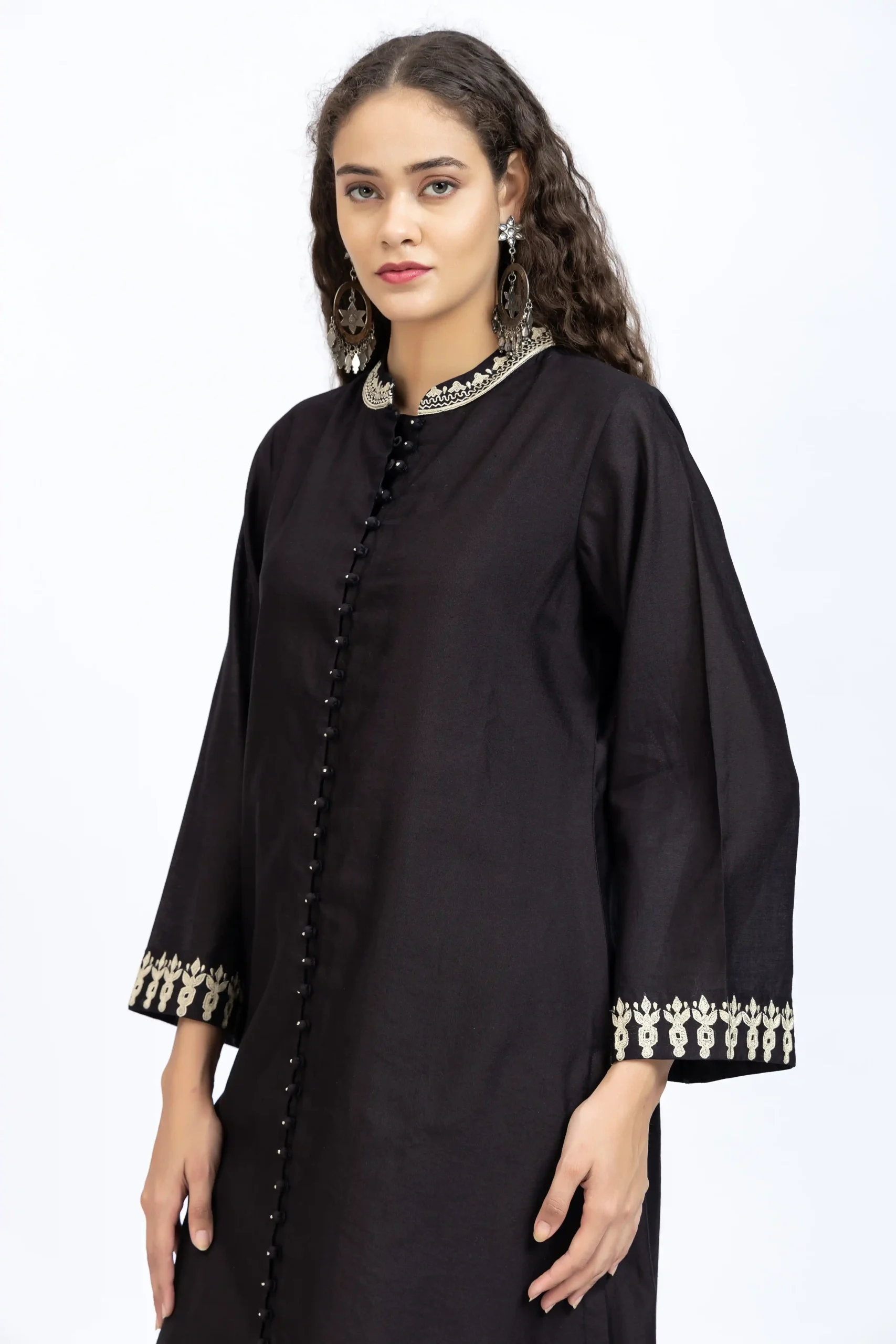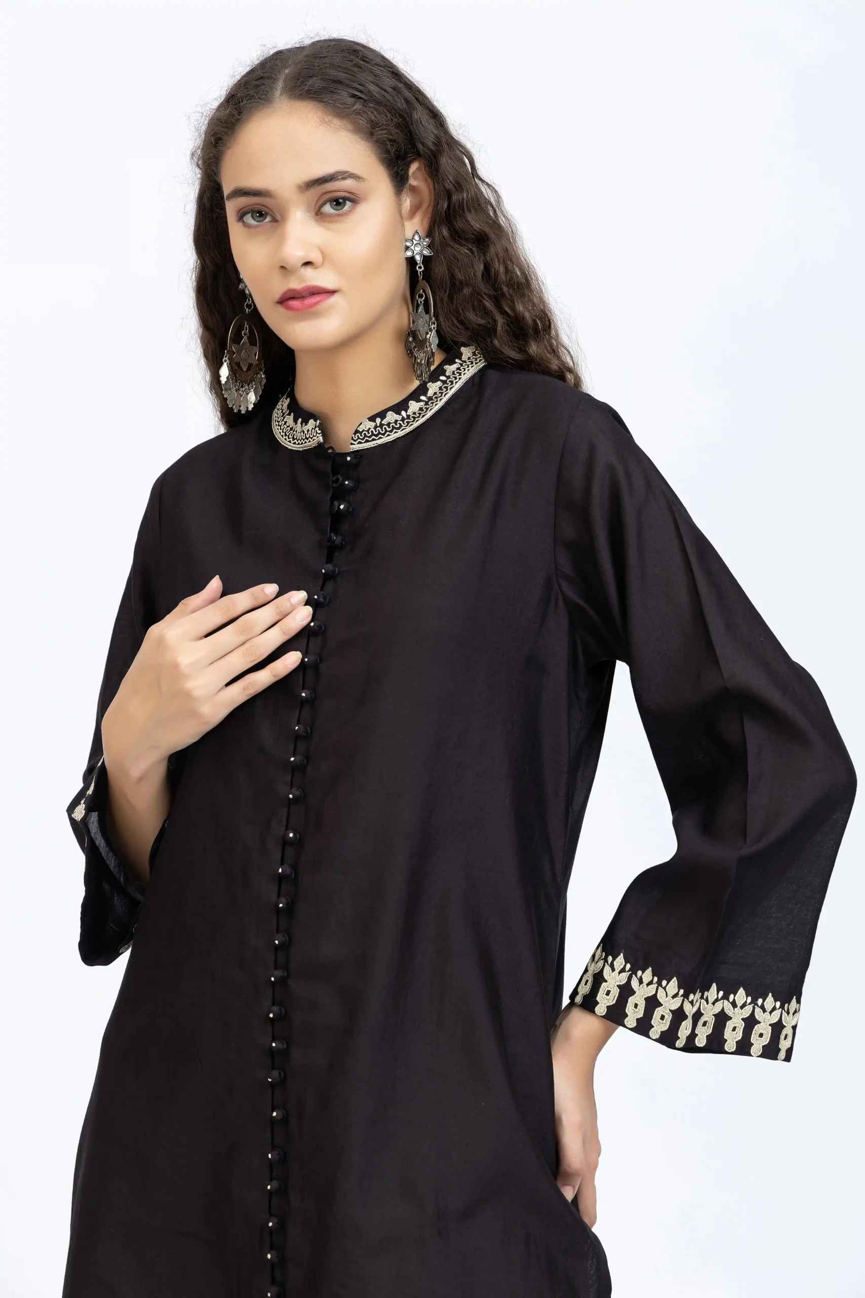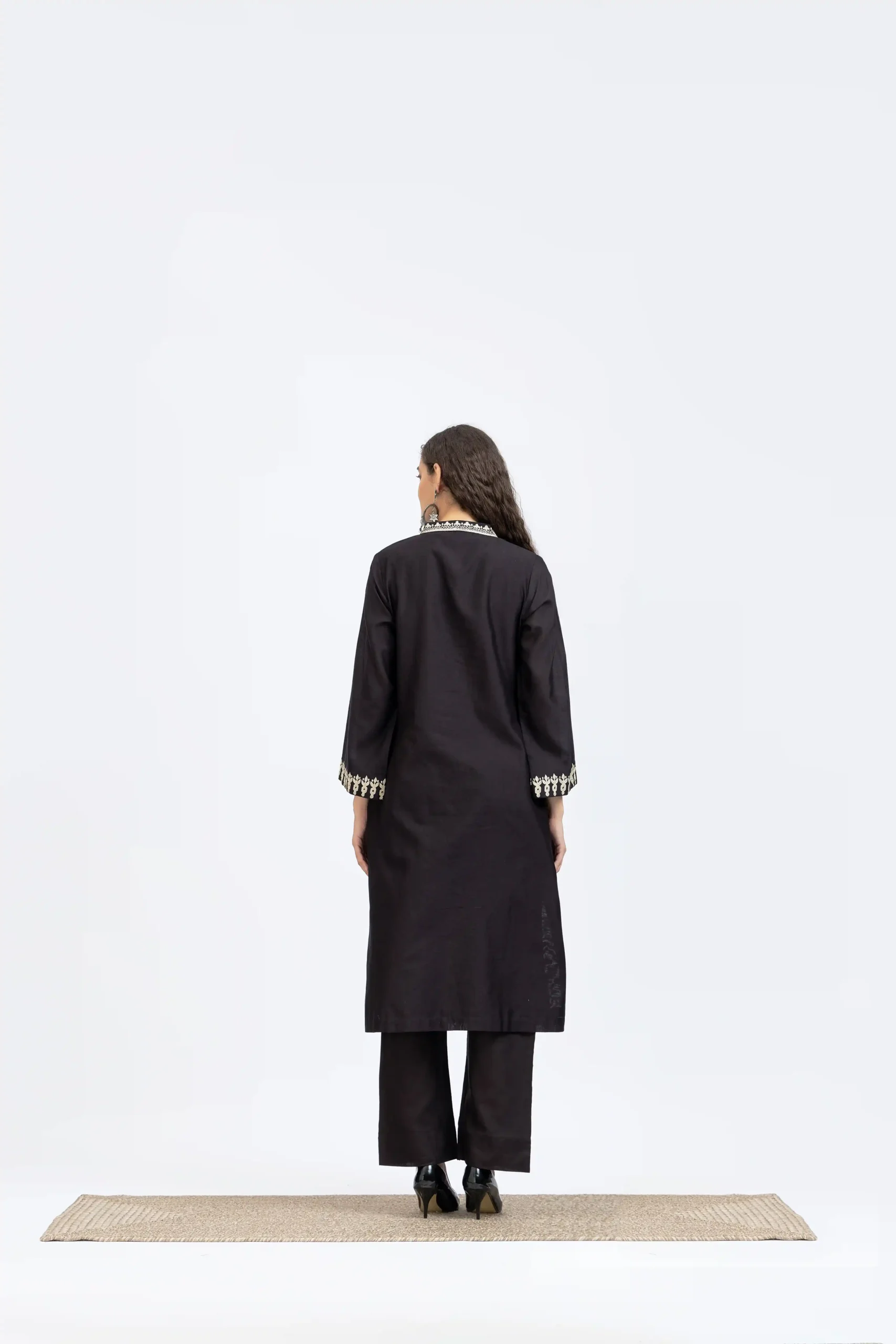 Black chanderi embroidered kurta paired with chanderi pants