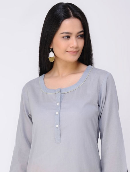 Grey Cotton Round Neck Kurta With Stitch Details