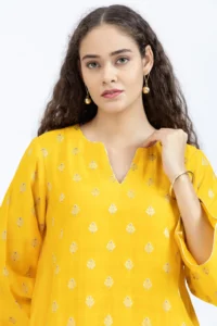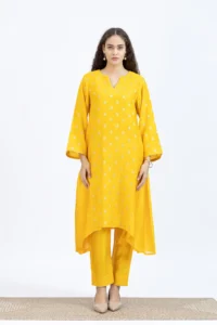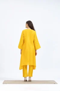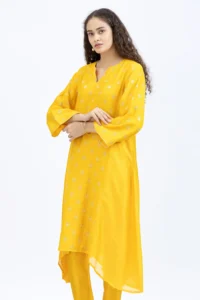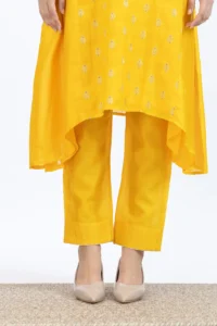 Product Name : Handwoven chanderi jacquard assymetrical kurta paired with Chanderi pants