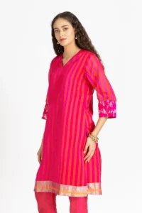 Product Name : Handwoven fuchsia chanderi stripes with chanderi jacquard trims