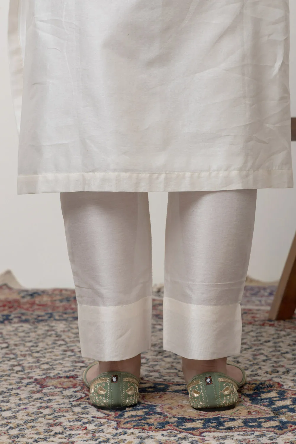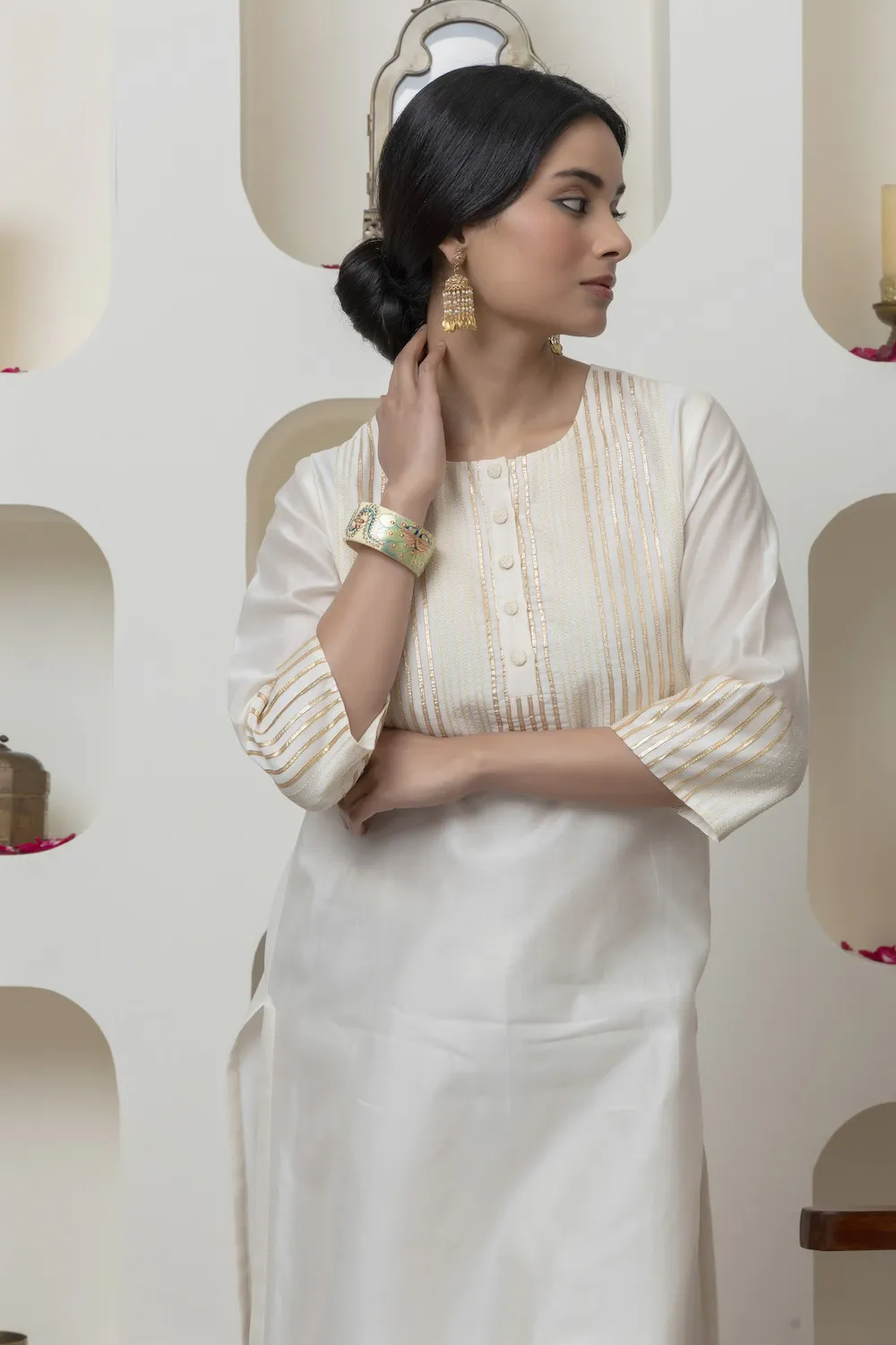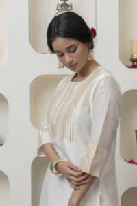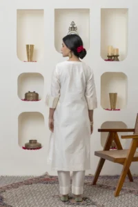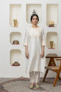 Off white chanderi kurta with Gota and embroidered yolk paired with Chanderi pants