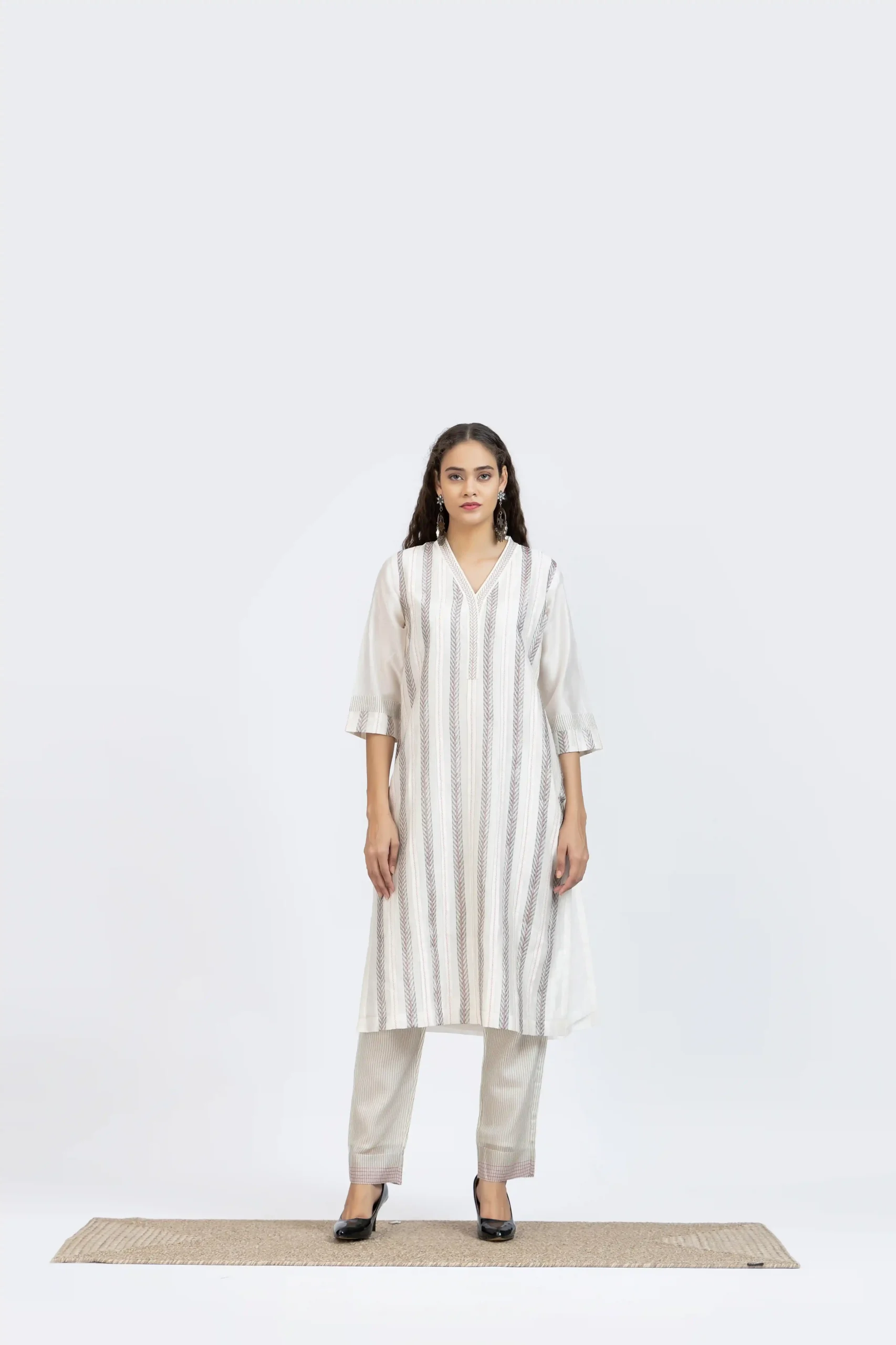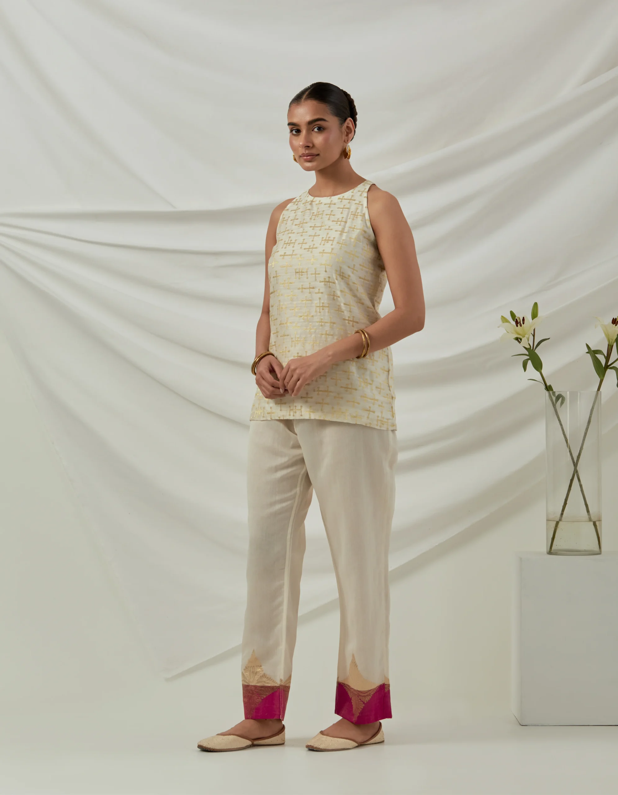 Hand woven Chanderi stripes printed kurta Ivory and pants