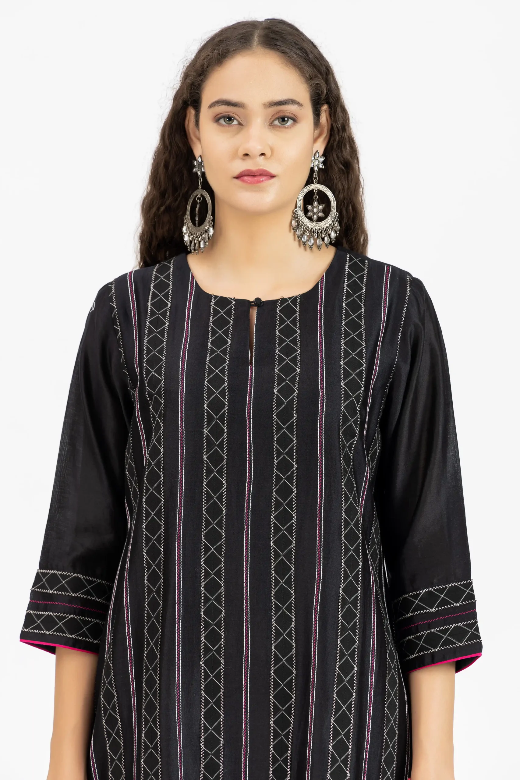 Black kurta with pintuck and jacquard trims