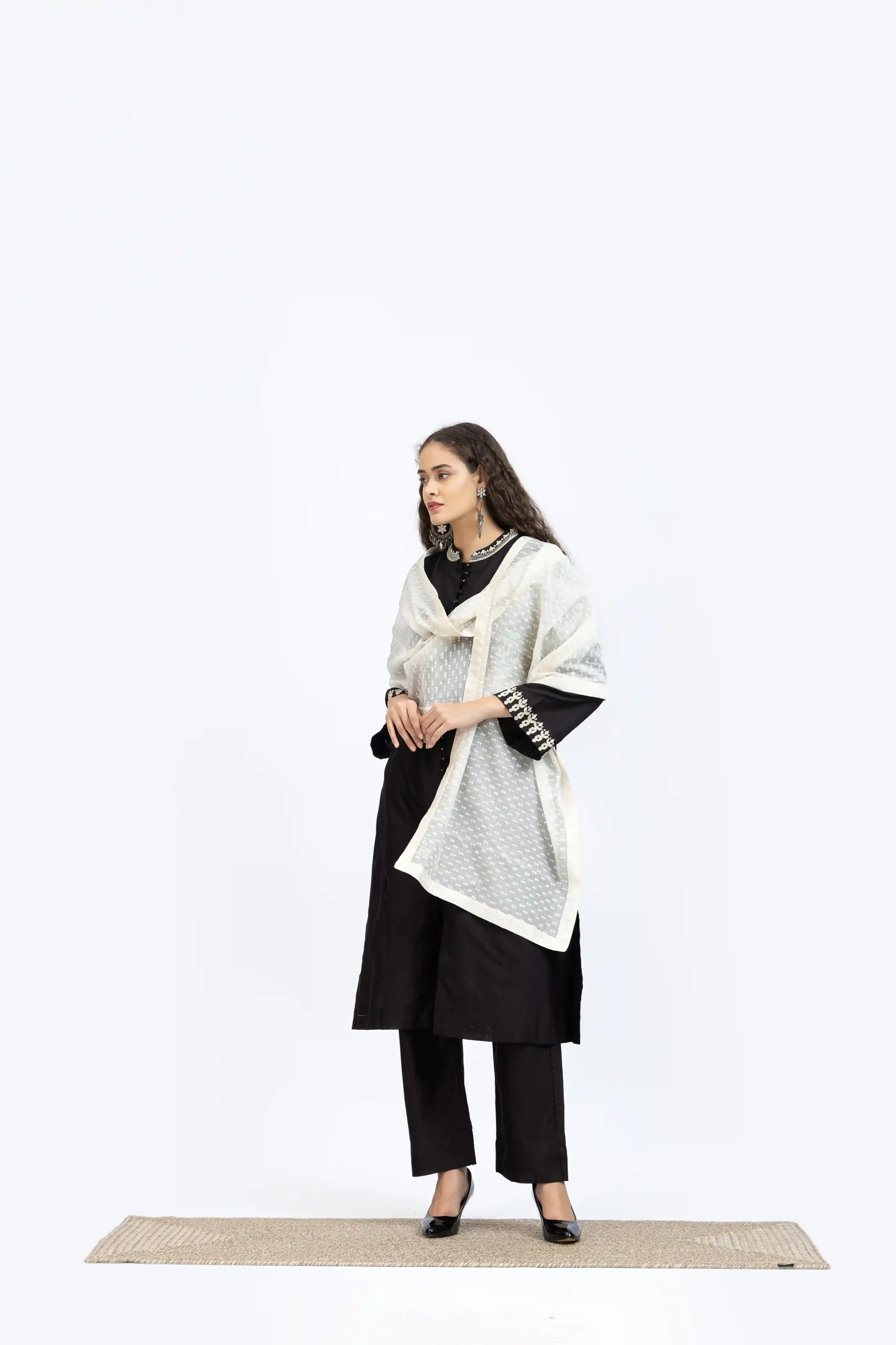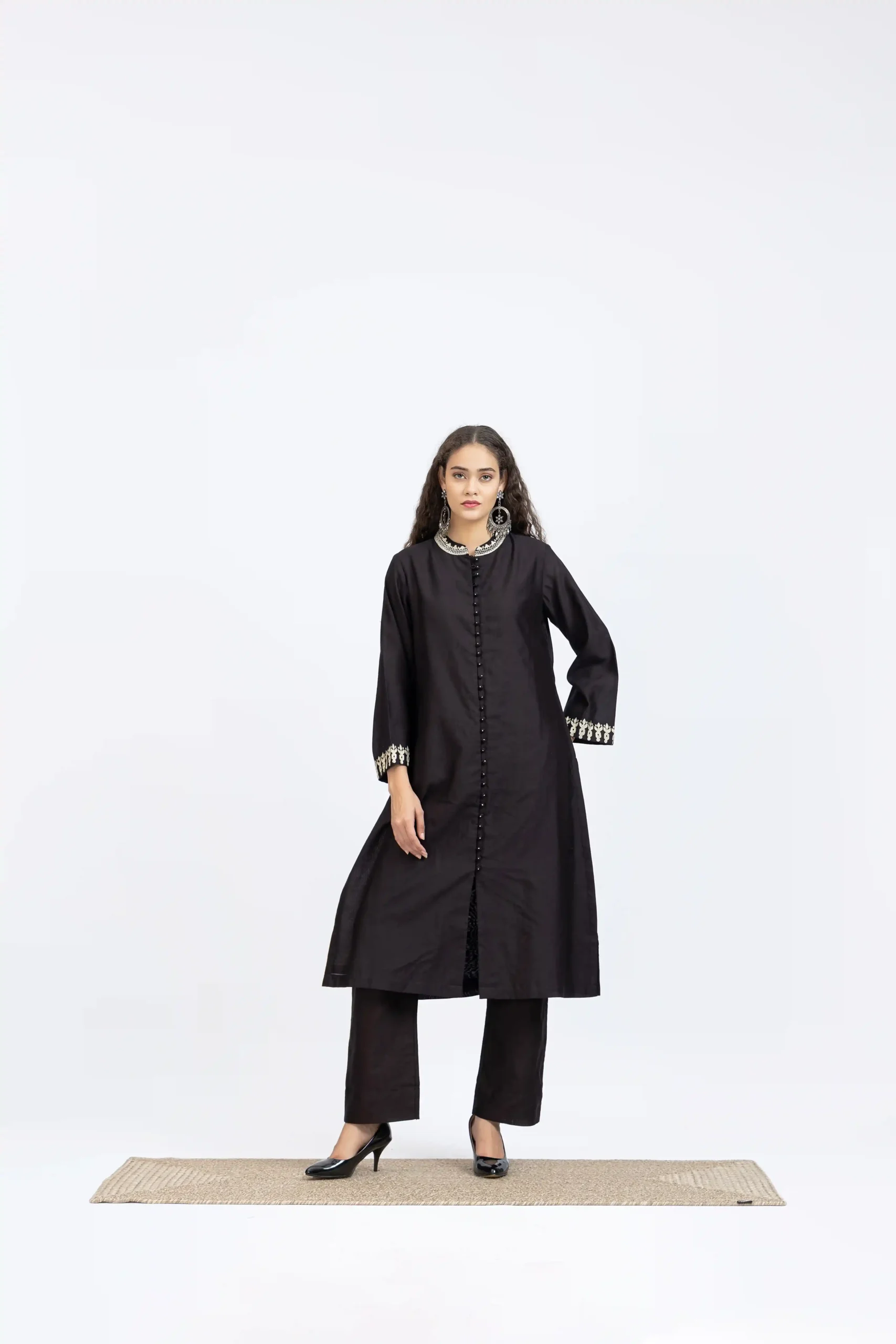 Black chanderi embroidered kurta paired with chanderi pants