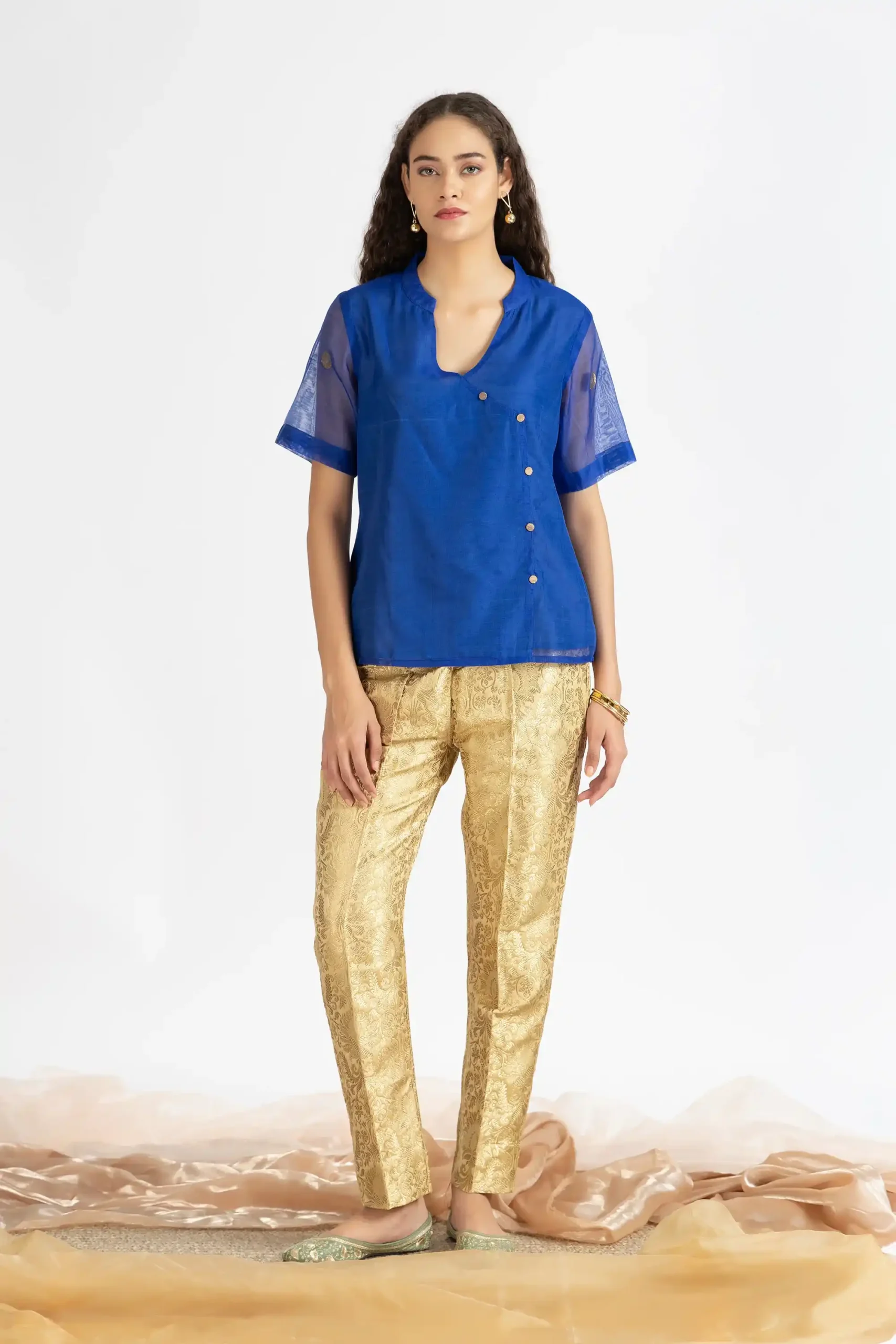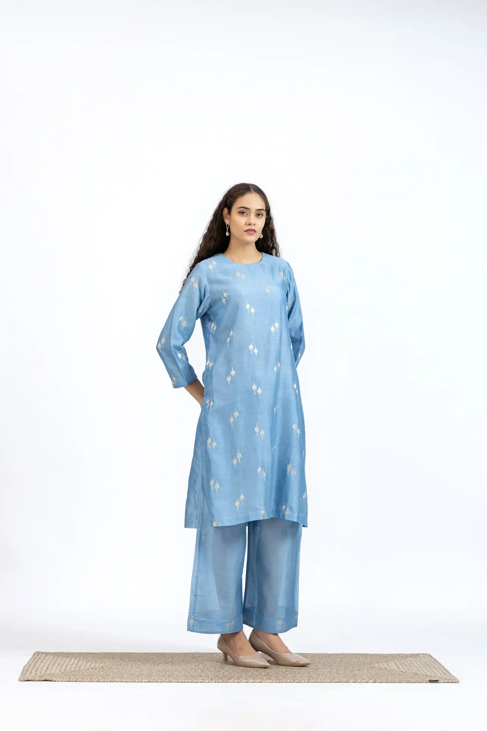 Handwoven blue chanderi jacquard kurta paired with chanderi flared pants