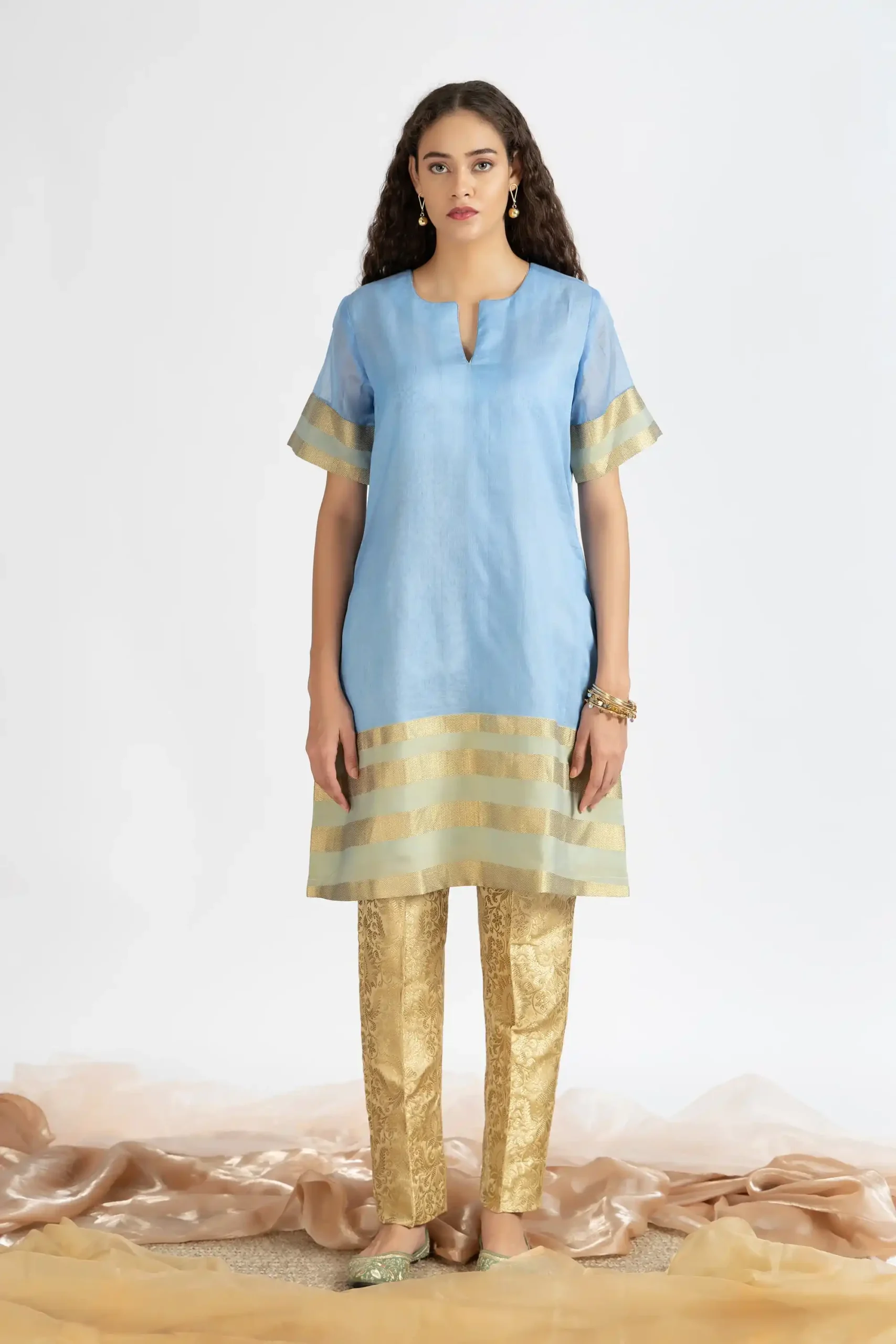 Light blue chanderi hand block printed kurta paired with cotton pants